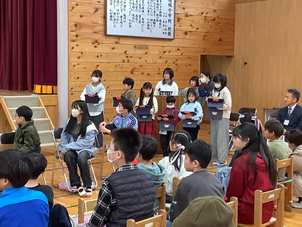 全校からの心のこもったプレゼント。6年生とてもうれしそうです。